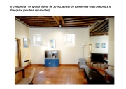 Il comprend : un grand séjour de 30 m2, au sol de tommettes et au plafond à la française (poutres apparentes)