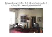 Il comprend : un grand séjour de 30 m2, au sol de tommettes et au plafond à la française (poutres apparentes),