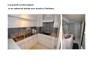une grande cuisine équipée et un cabinet de toilette avec douche à l’italienne